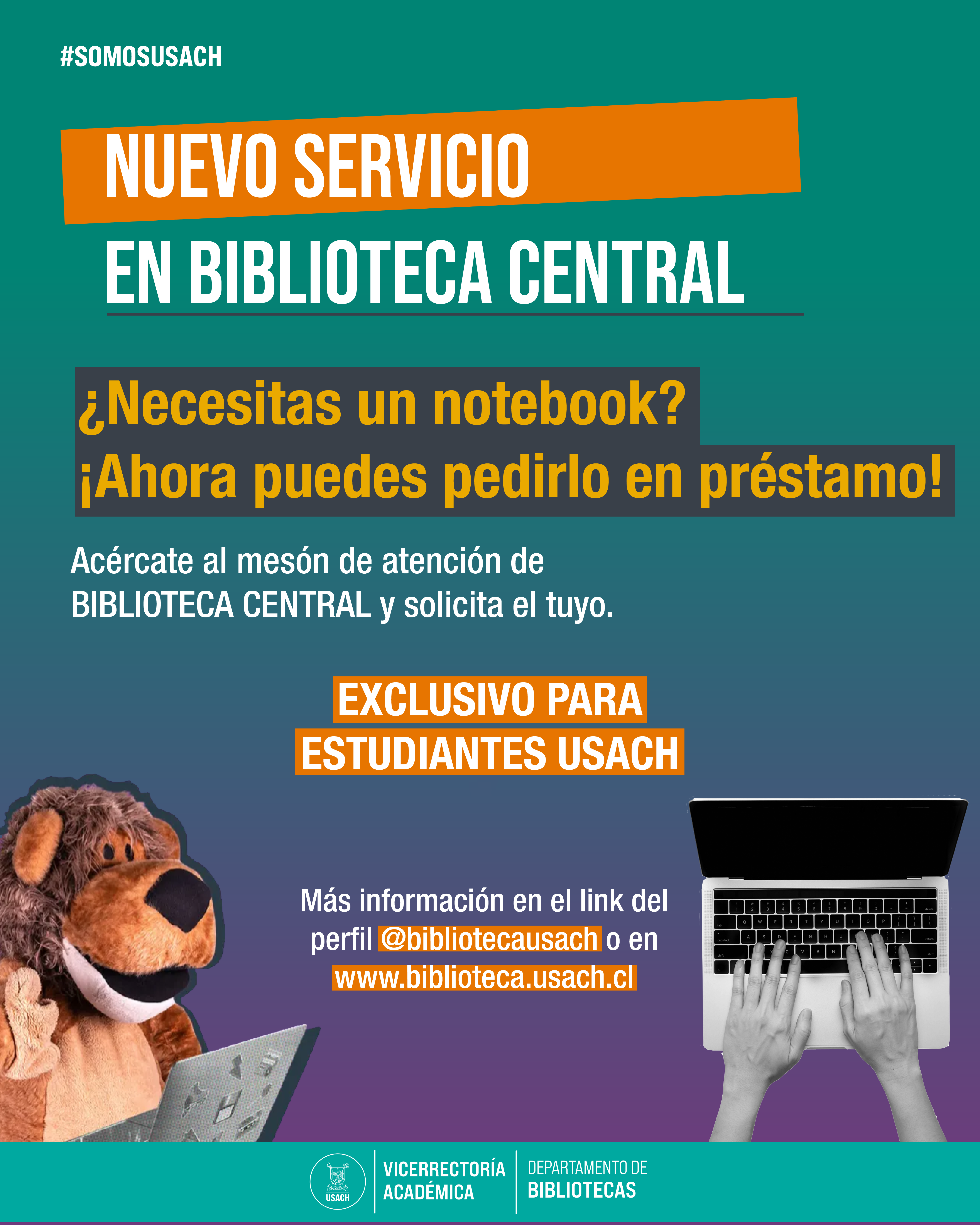 El servicio, disponible desde el 1 de abril de 2026, permitirá a las y los estudiantes solicitar un computador portátil para utilizarlo durante una jornada dentro del horario de funcionamiento de la biblioteca. El equipo deberá ser devuelto antes de las 20:00 horas del mismo día en el mesón de atención de Biblioteca Central.
