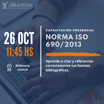Te invitamos a participar en el Taller: Aplicando correctamente la norma ISO 690 2013, se realizará el día 26 de octubre a las 11:45 AM en Biblioteca Central.